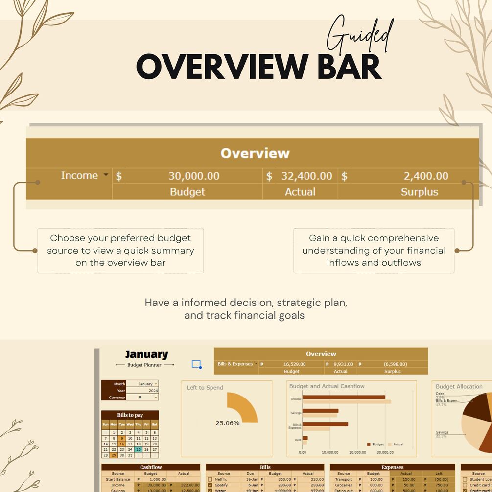 - Overview bar of your estimated budget for Savings, Income, Bills & Expenses, and Debt payments